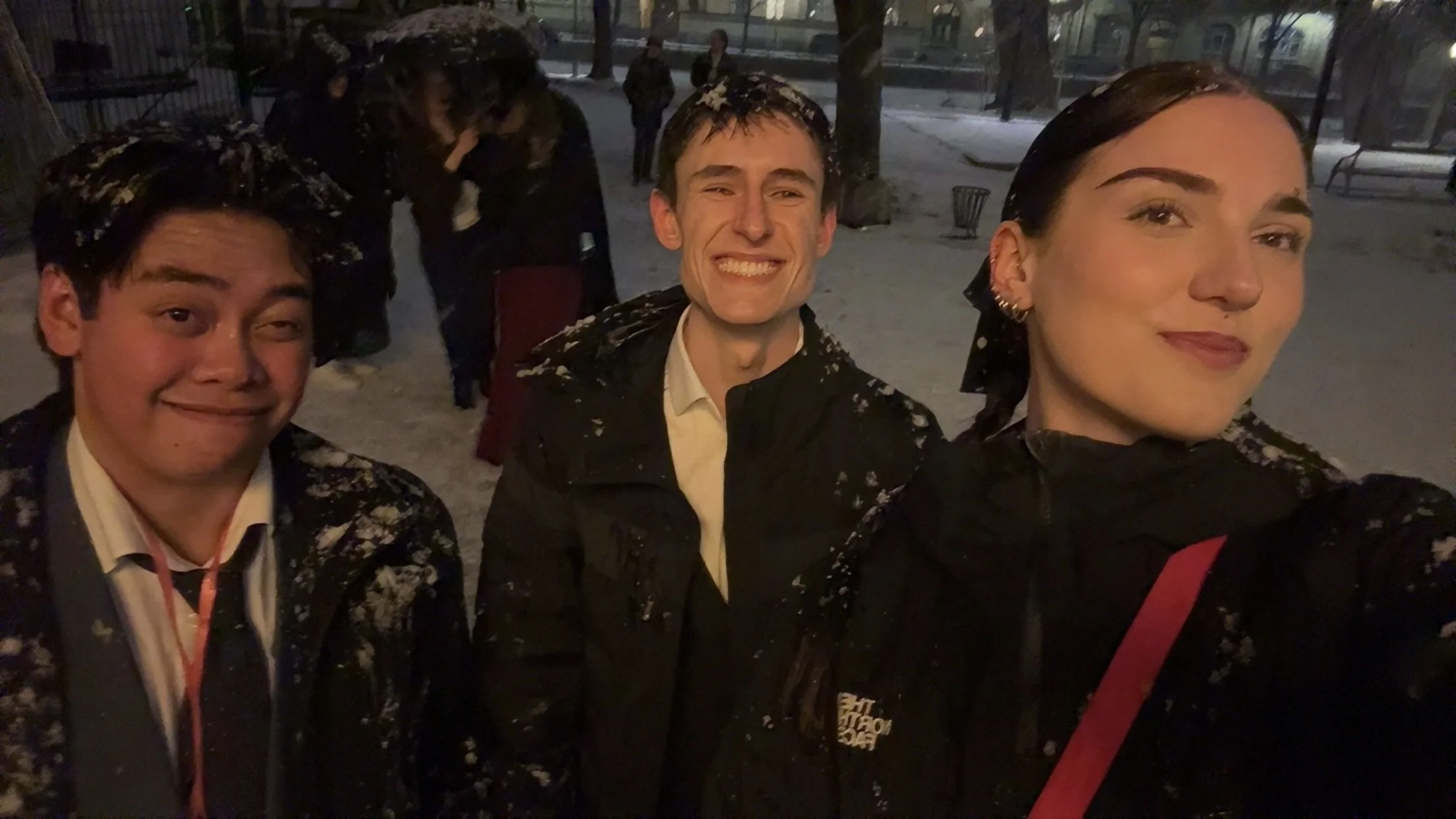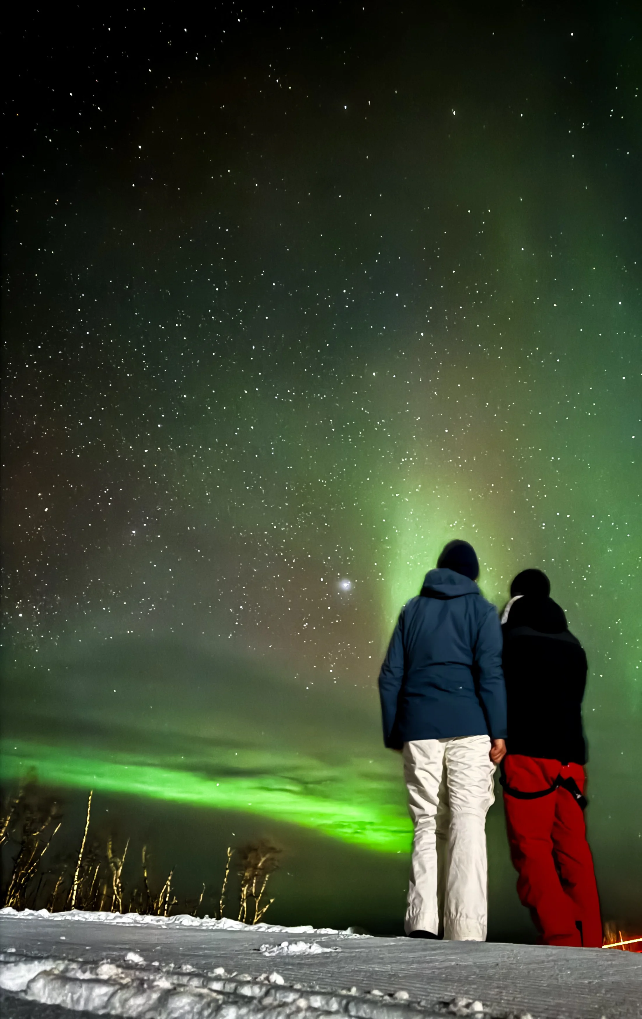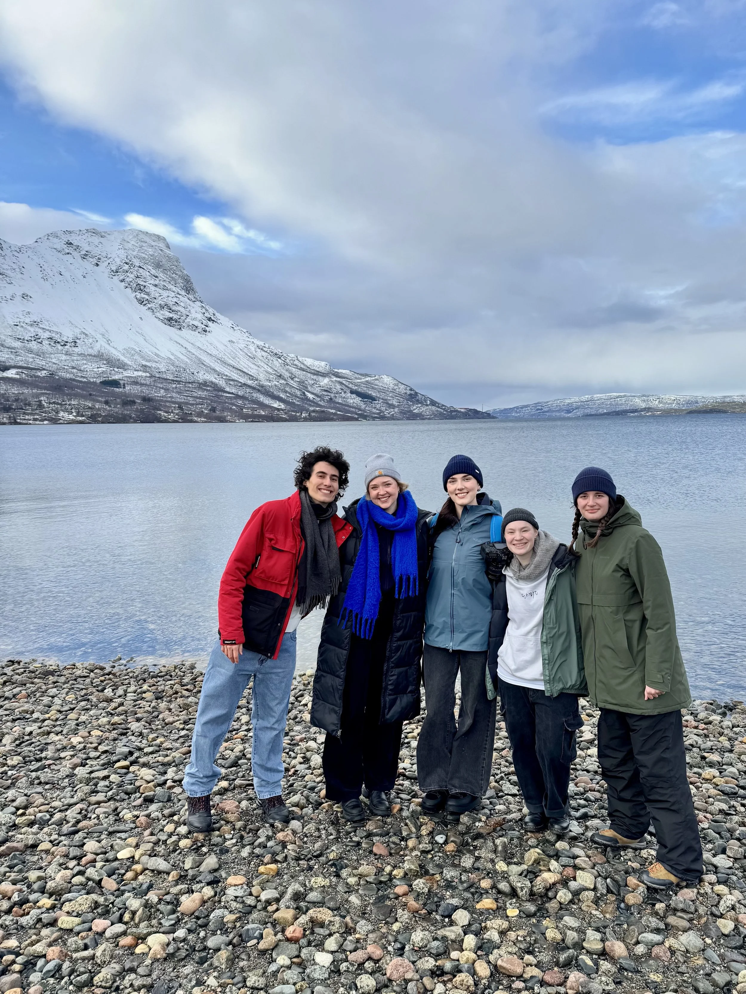 The next day, on Wednesday, we woke up early to take a mini day trip to Narvik, a small city in northern Norway! It was an hour bus ride there, but around 20 minutes outside the city, we stopped at this big lake at the base of a fjord, so that any brave souls who wanted to swim in the lake (around 4°C) could do so! I was not one of those brave souls, but it was a lot of fun watching all my cabinmates partake. We then had around four hours to explore Narvik! Our guide for the week, Aki, showed us some good lookout spots, gave us recommendations in the city, and then sent us on our way! I ended up exploring the city with two of the fadders for my group during the OP, Mai and Oliver. Mai, Oliver, and I ended up taking some scenic walks around the city, eating at the nearby University, and grabbing some souvenirs before we hopped back on the bus to Björkliden. Later that night, we had our snowshoe hike! This was a brand-new experience for most of us, as we had never even really seen enough snow to even think about using snowshoes. Even though we felt a little bit like penguins walking around with these contraptions strapped to our boots, it quickly became one of my favorite activities that I have ever done. We left around 8 PM and ended up extremely lucky with the weather, with skies 100% clear. So clear in fact, that we saw the northern lights! It was so surreal to see them in real life. We stopped a few times on our hike to sit and observe the beauty of the Laplands and the aurora borealis above us. After snapping some amazing pictures and being present in the moment with all my best friends, we went to bed that night extremely happy.